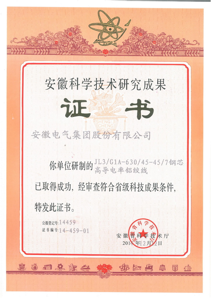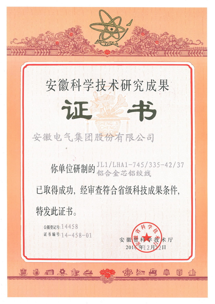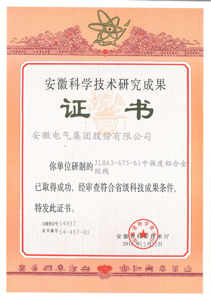 安徽電氣集團股份有(yǒu)限公司自(zì)主研制的(de)“JLHA3-675-61中強度鋁合金絞線”、“JL1/LHA1-745/335-42/37鋁合金芯鋁絞線”、“JL3/G1A-630/45-45/7鋼芯高(gāo)導電率鋁絞線”和(hé)“JL/LB20A-800/55-45/7鋁包鋼芯鋁絞線”等四類産品獲得安徽省科(kē)學(xué)技術廳正式頒發的(de)科(kē)學(xué)技術研究成果證書,相關研制人員也分别獲得了個人成果證書。
